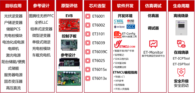 - 2. 单核主流系列:ET6039/6039C,主频 Cortex-M7 300 MHz,内置CORDIC和FMAC加速器;内置2 bank x 256KB PFlash和1bank 128KB DFlash,支持Runtime OTA;集成3个12bit 4MSPS ADC,支持多达23通道输入;8个ACMP,可组成4对窗比较器;集成高精度SRPWM模块,其中8个HRPWM通道(精度156pS); 还支持PMBus、CAN FD、UART/I2C/SPI等通信接口;支持安全启动和安全升级,符合RED-DA信息安全要求;适用于光伏逆变器、V2G充电桩、AI 服务器电源等场景。
