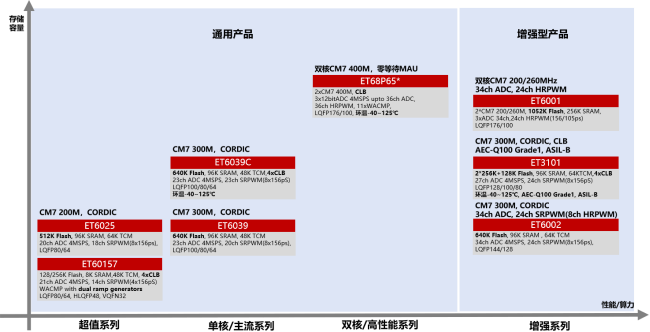 - 3. 双核高性能系列:ET68P65,双核 Cortex-M7 400 MHz,支持零等待MAU,算力再次翻倍。